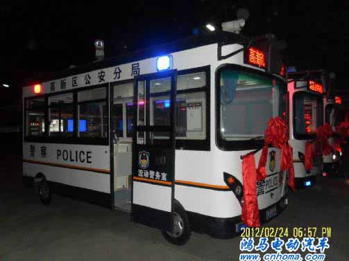 2012年2月24日下午,三臺(tái)白色車身的鴻馬流動(dòng)警務(wù)室在鴻馬電動(dòng)汽車公司長葛生產(chǎn)基地整裝待發(fā),即將前往山東上崗執(zhí)勤。這是自山東桓臺(tái)流動(dòng)警務(wù)室 、山東魚臺(tái)移動(dòng)警務(wù)站、山東濟(jì)寧市嘉祥縣“配備”流動(dòng)警務(wù)室、高唐縣交警大隊(duì)流動(dòng)警務(wù)站等等后,發(fā)往山東高新區(qū)的移動(dòng)警務(wù)室。