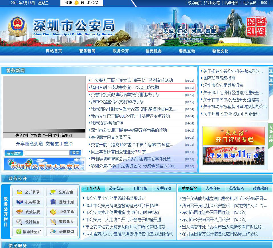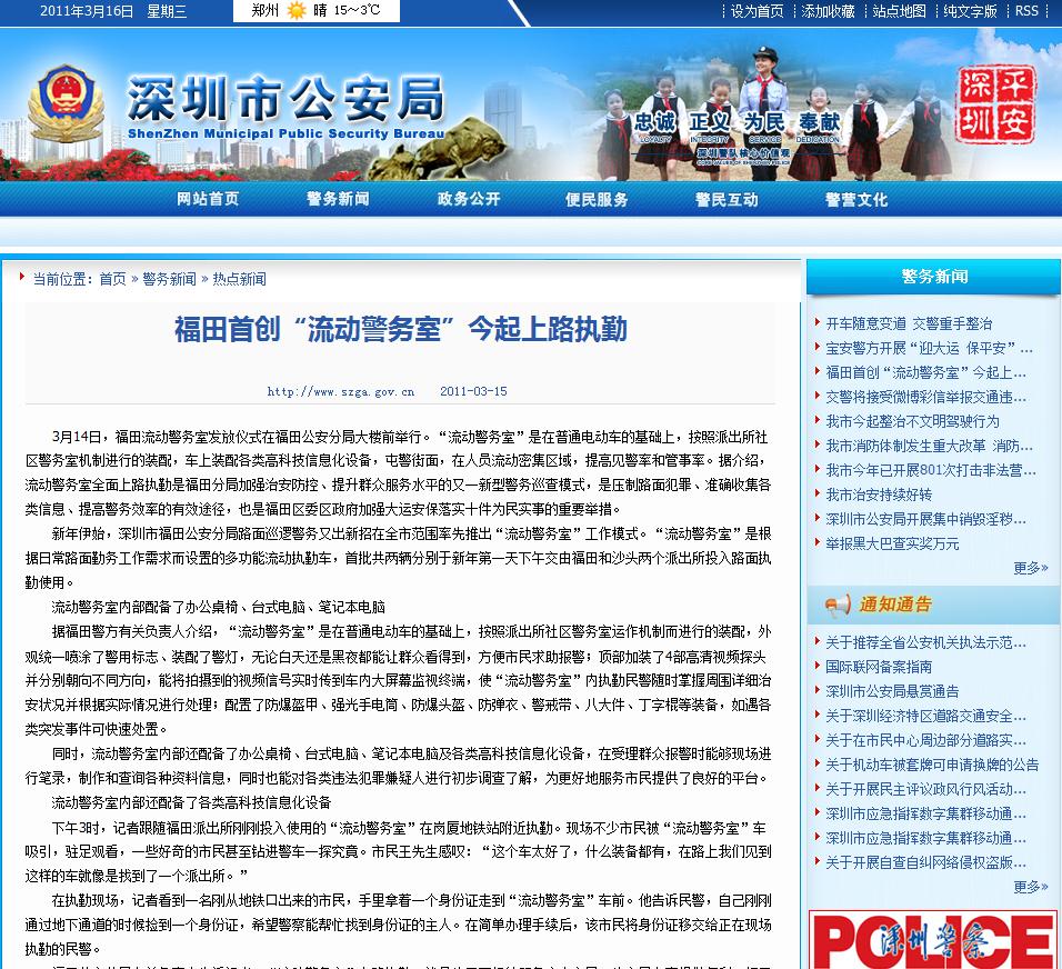 3月14日,福田流動(dòng)警務(wù)室發(fā)放儀式在福田公安分局大樓前舉行!傲鲃(dòng)警務(wù)室”是在普通電動(dòng)車的基礎(chǔ)上,按照派出所社區(qū)警務(wù)室機(jī)制進(jìn)行的裝配,車上裝配各類高科技信息化設(shè)備,屯警街面,在人員流動(dòng)密集區(qū)域,提高見(jiàn)警率和管事率。據(jù)介紹,流動(dòng)警務(wù)室全面上路執(zhí)勤是福田分局加強(qiáng)治安防控、提升群眾服務(wù)水平的又一新型警務(wù)巡查模式,是壓制路面犯罪、準(zhǔn)確收集各類信息、提高警務(wù)效率的有效途徑,也是福田區(qū)委區(qū)政府加強(qiáng)大運(yùn)安保落實(shí)十件為民實(shí)事的重要舉措。
