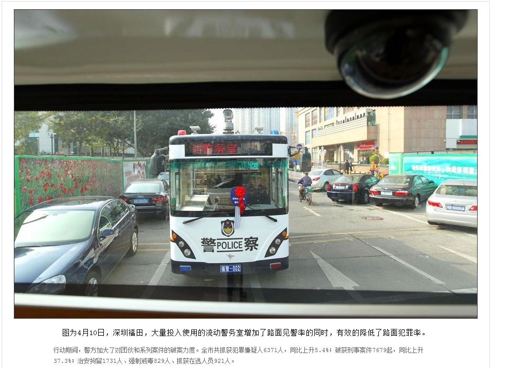 圖為4月10日,深圳福田,大量投入使用的流動警務室增加了路面見警率的同時,有效的降低了路面犯罪率。
