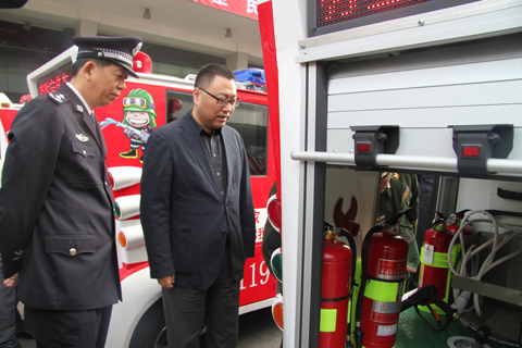 上海虹口區(qū)區(qū)長(zhǎng)曹立強(qiáng)(中)參觀鴻馬消防宣傳車
