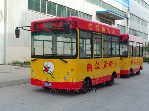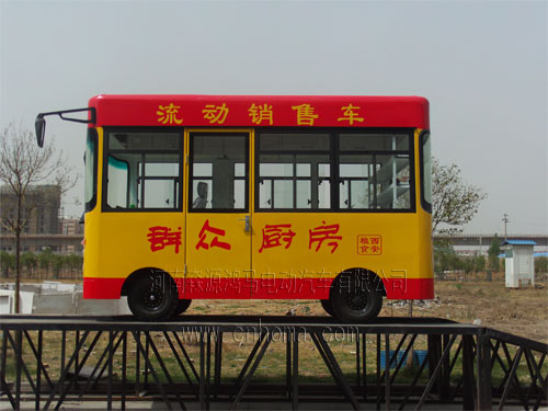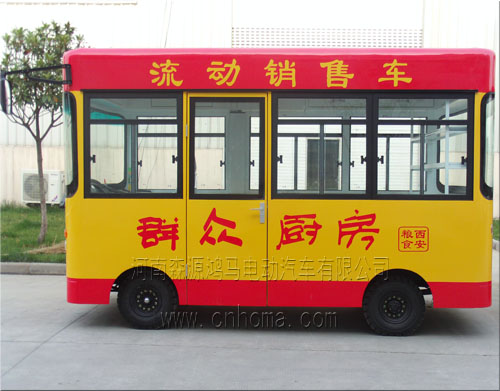 該車車身主題為黃色,車頂和底部為橙色,并且印有“流動(dòng)銷售車,群眾廚房”等字樣,再加上頭戴廚師帽的卡通人物形象,讓人感覺倍加親切。車的前后各有一塊LED顯示屏,可以使我們的廣告語或者宣傳口號循環(huán)展示。車的內(nèi)部布置合理,除了桌椅以外,還有空調(diào),貨架,櫥柜等等。放上商品,就是一個(gè)小型店鋪,最重要的是它可以隨時(shí)移動(dòng),比較靈活,更加適應(yīng)現(xiàn)代化快節(jié)奏的都市生活。行駛在大街上,宛如一道亮麗的風(fēng)景線。