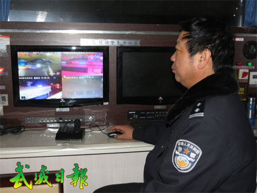 甘肅武威民警在鴻馬移動警務室監(jiān)控街面情況