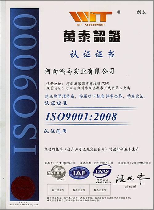 鴻馬電動(dòng)車臺(tái)面外觀設(shè)計(jì)專利證書(shū)