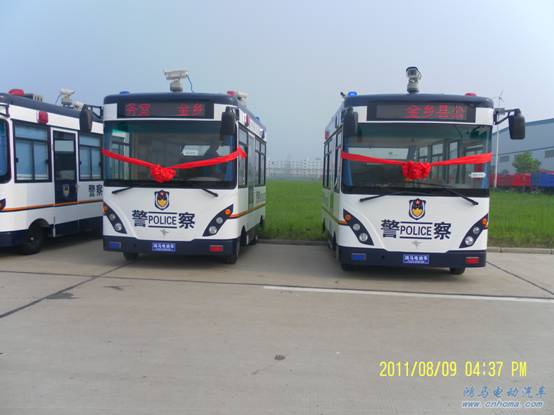 8月9日,2臺(tái)4.2米長(zhǎng)的流動(dòng)警務(wù)室停放在森源鴻馬電動(dòng)汽車(chē)生產(chǎn)基地的廣場(chǎng)內(nèi),它們即將發(fā)往山東濟(jì)寧市金鄉(xiāng)縣公安局進(jìn)行執(zhí)勤任務(wù)。