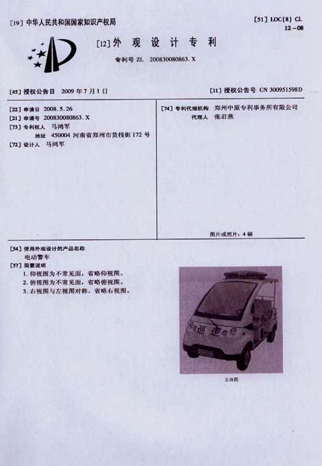 鴻馬電動(dòng)汽車公司生產(chǎn)的電動(dòng)警車,外觀設(shè)計(jì)已獲專利,本外觀設(shè)計(jì)巾幗中華人民共和國(guó)國(guó)家知識(shí)產(chǎn)權(quán)局依照中華人民共和國(guó)專利法進(jìn)行初步審查,決定授予專利權(quán),頒發(fā)外觀設(shè)計(jì)專利證書并在專利登記簿上予以登記。