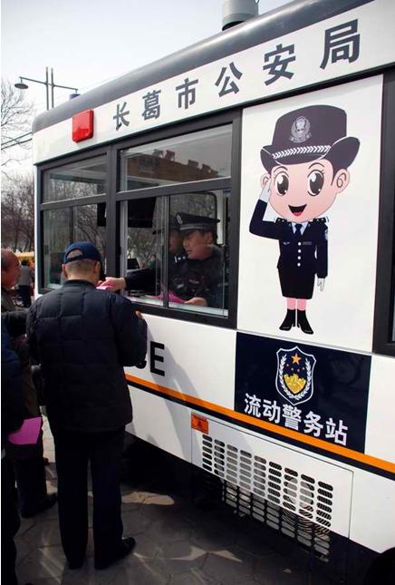 長葛市公安局建設(shè)路派出所民警駕駛流動警務(wù)車到社區(qū)開展便民利民服務(wù)